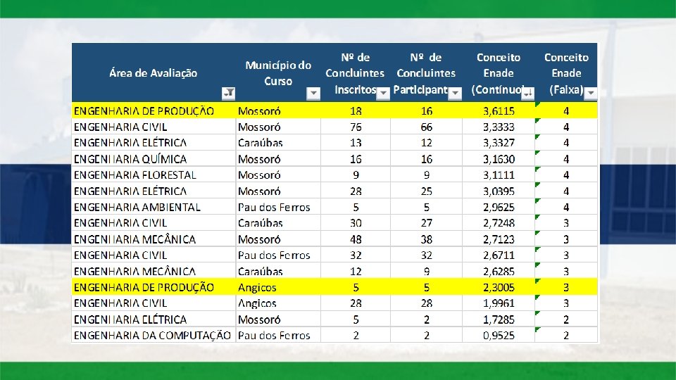 • Dos 494 cursos com conceito: • 44 - UFRN/Natal: 3, 6398 | 4 • 47 - UFERSA/Mossoró: 3, 6115 | 4 • 215 - UNP/Mossoró: 2, 3819 | 3 • 238 - UFERSA/Angicos: 2, 3005 |3 • 471 - ESTÁCIO DE NATAL: 1, 1281 | 2 • 474 - UNP/Natal: 1, 0916 | 2