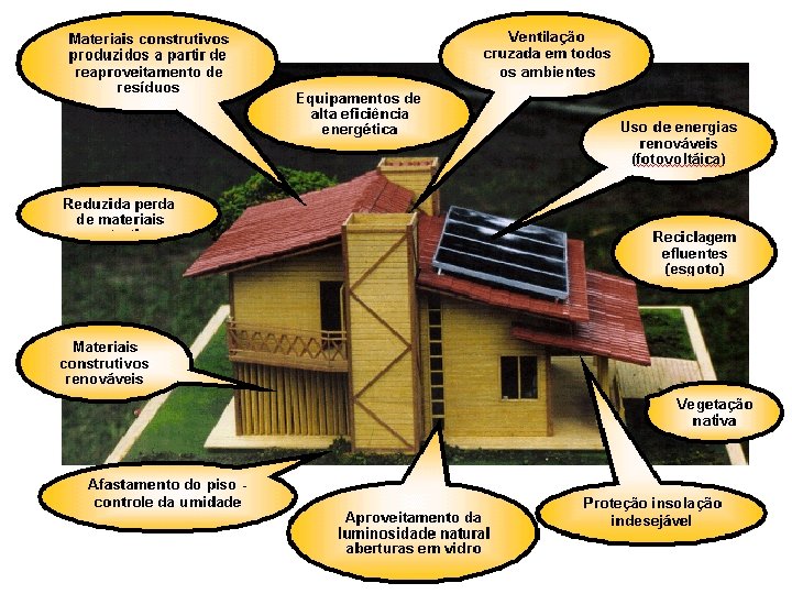 Características das Habitações Ecológicas 1. Utilização principal da energia natural; 2. Disposição de um depósito no exterior, para o aproveitamento das águas pluviais; 3. Reciclagem dos resíduos produzidos durante a construção, contribuindo para a redução de poluição; 4. Maior eficiência energética (água, energia, gestão dos resíduos); 5. Compatibilidade com o ambiente natural onde se insere a construção; 6. Utilização de materiais reciclados e recicláveis; [http: //www. radames. manosso. nom. br/ambiental/moradia. htm]