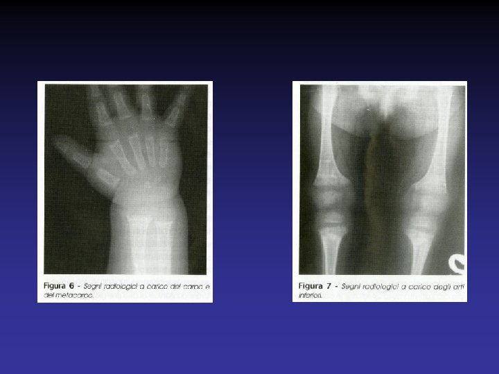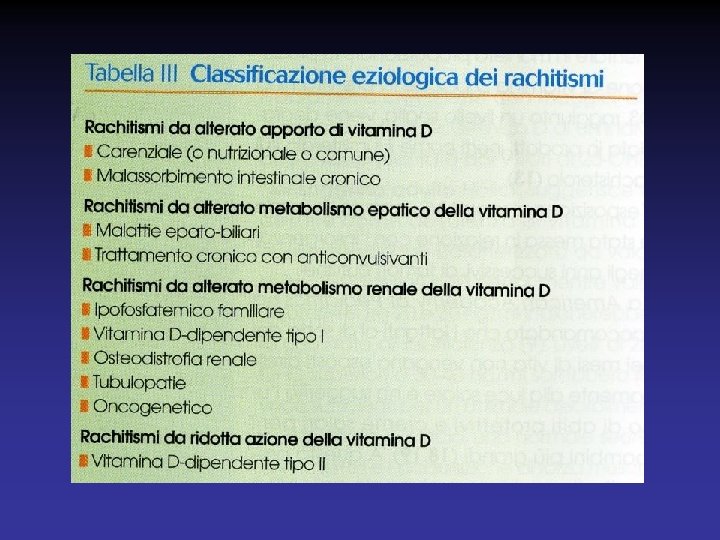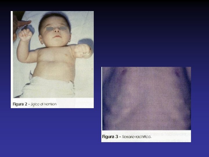 SEGNI BIOCHIMICI DEL RACHITISMO Ø STADIO 1 : valori aumentati di fosfatasi alcalina e di PTH, valori ridotti di 25 -OHD, ipocalcemia difficile da documentare, normofosforemia Ø STADIO 2 : ulteriore diminuzione di 25 -OHD, e aumento di fosfatasi alcalina e PTH Ø STADIO 3 : riduzione franca di 25 -OHD, ipocalcemia e ipofosforemia