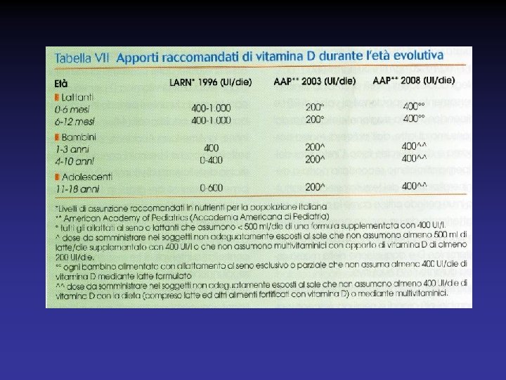 PROFILASSI DEL RACHITISMO • Si attua somministrando vit. D e non i suoi metaboliti attivi • Apporto giornaliero raccomandato 400 UI/die • La profilassi con vit. D deve essere effettuata nei neonati sottoposti ad allattamento esclusivo al seno o che non assumono latte formulato • L’AAP raccomanda che la supplementazione con 400 UI/die continui nell’infanzia non ponendo un limite preciso alla durata della profilassi • L’insufficiente esposizione al sole e l’inadeguato apporto alimentare pongono l’indicazione alla supplementazione con vit. D nei bambini e negli adolescenti • Malassorbimento cronico dei grassi, terapie con anticonvulsivanti possono richiedere supplementazioni maggiori