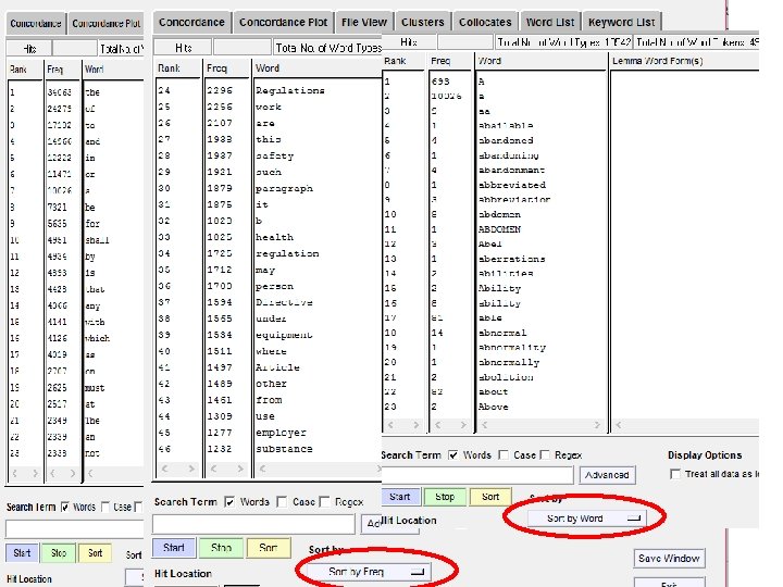 Key concepts and technical notions • Wordlist, frequency list, keyword list • Types, tokens, type/token ratio (lexical variation) • Function/grammatical words vs. content/lexical words (lexical density) • Concordance (concordancing software) • KWIC (keyword in context) • Nodeword • Sorting