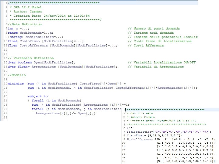INSERIMENTO DATI Esistono essenzialmente due modi per inizializzare i dati in OPL : • Inizializzazione Interna (Internal Initialization): consiste nell’inserire i dati nel momento stesso in cui essi vengono dichiarati, quindi nel file. mod; • Inizializzazione Esterna (External Initialization): prevede l’inserimento successivo dei dati, come dichiarazione OPL, in un file separato (. dat). La netta separazione tra il modello ed i dati assicura che lo stesso modello può essere applicato a molti casi senza indurre lavoro supplementare. In questo modo è possibile creare istanze diverse dello stesso problema, senza modificare il modello di riferimento. N. B. In un data File (. dat) è anche possibile creare la connessione ad un foglio di calcolo esterno (es. Foglio excel) da cui leggere i dati. La parola chiave per creare questo collegamento è Sheet. Connection