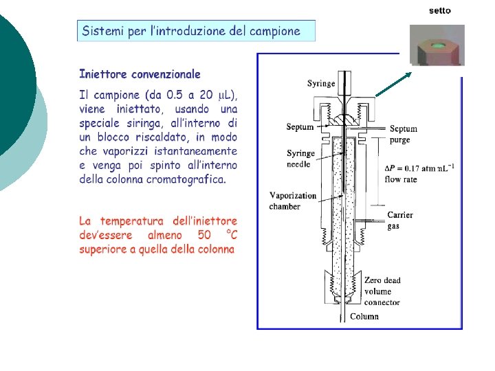 Rivelatore a cattura di elettroni ¡ ¡ si misura la diminuzione di corrente dovuta alla cattura di elettroni da parte di analiti all’uscita della colonna è sensibile soprattutto a composti con gruppi funzionali elettrofili (alogeni, perossidi, nitrogruppi, ecc. ) Una sorgente di radiazioni β (emesse da tritio o 63 Ni) provoca la ionizzazione del gas di trasporto: Analiti(X) con elevata affinità elettronica possono catturare gli elettroni: La ricombinazione fra ioni N 2+e X- è 105 -108 volte più probabile di quella fra N 2+ ed elettroni. Si osserva una diminuzione di corrente al passaggio di analitielettron-affini ¡ ¡ la sensibilità è ottima per gli idrocarburi clorurati è un sistema non distruttivo