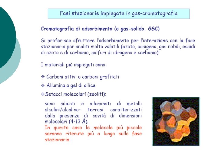 Meccanismi principali di separazione Esclusione: La fase stazionaria è un solido poroso. In tali pori possono sostare le molecole degli analiti.