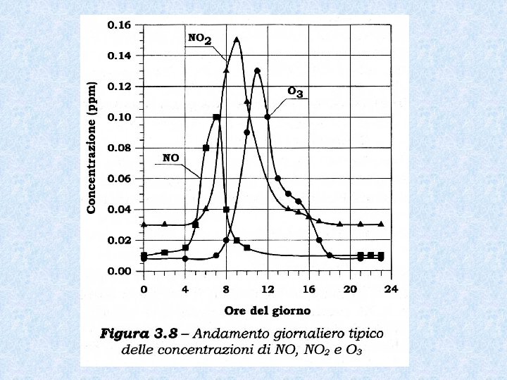 • Nelle aree urbane la concentrazione di NO comincia ad aumentare nelle prime ore della mattina (autoveicoli, accensione impianti termici); dopo alcune ore la concentrazione di NO inizia a diminuire ed aumenta quella di NO 2 a causa del processo di ossidazione dell’NO • Durante le ore centrali della giornata, a mano che aumenta la radiazione solare, aumenta anche la frazione di NO 2 che si converte in NO, originando l’ossigeno monoatomico che produce poi l’ozono • Sfasamento dei processi di produzione di NO, NO 2 e O 3 • Effetti nocivi smog fotochimico: irritazione vie respiratorie, affaticamento, edemi polmonari. • Danni vegetazione (necrosi foglie dovuta all’ozono)