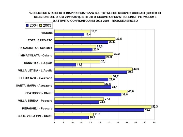 SINTESI DEL LAVORO Ø Campionamento casuale delle cartelle cliniche sui ricoveri dell’area medica effettuati nel 2004 ed assegnati ai 43 DRG a rischio di inappropriatezza Ø Verifica della effettiva inappropriatezza dei ricoveri campionati e ed attribuzione ad essi di una classe di severità clinica Ø Studio delle risorse utilizzate nei processi diagnosticoterapeutici: analisi delle giornate di degenza e della rilevanza clinica, e produzione di reports contenenti i DRG da ricondurre ai livelli assistenziali inferiori Ø Combinazione delle giornate di degenza di ogni DRG scelto, con le proporzioni della severità clinica, in modo da ottenere la percentuale di ricoveri inappropriati da ricondurre sulle attività di Day Service e Day Hospital, pesate per le condizioni cliniche del paziente
