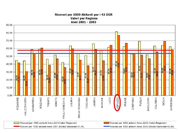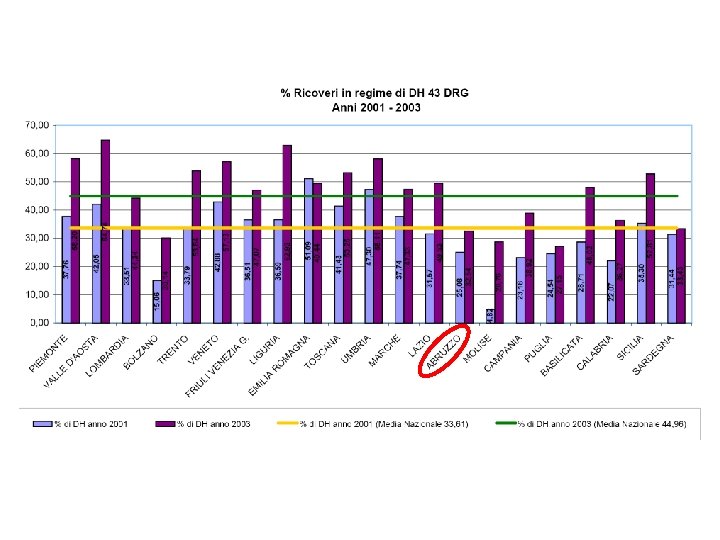 RIFERIMENTI NORMATIVI - IV Il D. P. C. M. 29 novembre 2001 – “Definizione dei livelli essenziali di assistenza” - (LEA) Ø Codifica un elenco di 43 DRG a rischio di inappropriatezza e li definisce “ricoveri in regime ordinario o in Day Hospital che le strutture sanitarie possono trattare in un diverso setting assistenziale con identico beneficio per il paziente e con minore impiego di risorse” Ø Stabilisce che le regioni individuino soglie di ammissibilità e ulteriori DRG inappropriati Ø Fissa una serie di indicatori per il macrolivello ospedaliero per il controllo dell’appropriatezza clinica e organizzativa