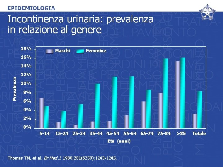 I. U. EPIDEMIOLOGIA L’incontinenza è prevalente nel sesso femminile con una Incidenza progressivamente crescente con l’avanzare dell’età. Nel Norwegian EPINCONT Study del 2000 le percentuali riportate sono rispettivamente del 2. 6 (20 -39 aa) 6. 5 (40 -54 aa) 8. 6 (55 -69 aa) 13. 0 (>70 aa)
