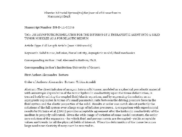 UNIVERSITA’ DEGLI STUDI DI GENOVA FACOLTA’ DI INGEGNERIA UN MODELLO POROELASTICO PER LO STUDIO DELL’INFUSIONE DI UN FARMACO ALL’INTERNO DI UN TESSUTO TUMORALE Allievo: Tobias Ansaldi Relatore: Chiar. mo prof. Alessandro Bottaro Anno accademico 2009/2010 Marzo 2011