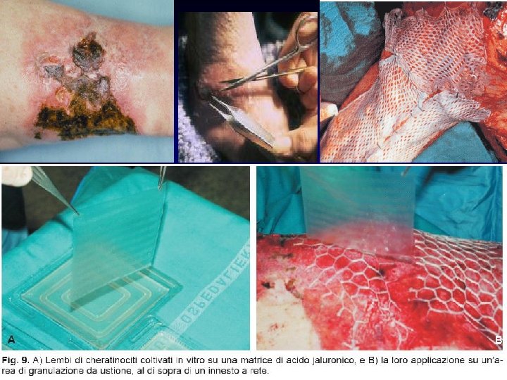 Ustioni Terapia ØLe ustioni di I grado guariscono in 5 -7 gg senza esiti cicatriziali ØLe ustioni di II grado superficiali guariscono in 9 -15 gg grazie agli elementi epiteliali superstiti (pilo sebacei, ghiandole sudoripare) ØLe ustioni di II grado profonde guariscono in 15 -20 gg con esiti cicatriziali ( cicatrici choidee, retraenti) dipendenti dalle infezioni, dal tipo di medicazione ØLe ustioni di III grado guariscono con formazione di tessuto di granulazione e riepitilizzazione dai margini