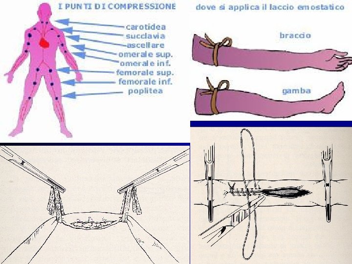 EMOSTASI Manovra che si impiega per prevenire od arrestare l’emorragia Emostasi terapeutica temporanea : üCompressione dei vasi con laccio, con le mani, con un manicotto pneumatico o fasciatura Emostasi terapeutica definitiva : üLegatura dei vasi con laccio o dopo transfissione, elettrocoagulazione, sutura riparativa della parete vasale