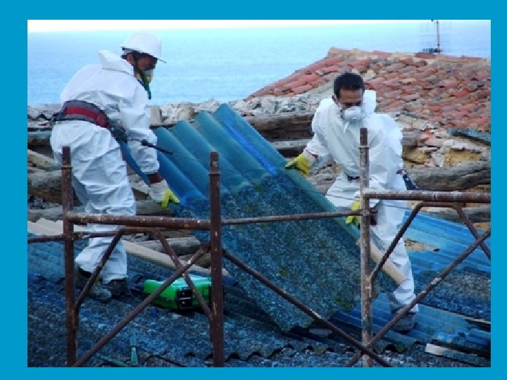 Metodi di bonifica: rimozione • È il procedimento più diffuso perché elimina ogni fonte di esposizione ed ogni necessità di attuare specifiche cautele per le attività che si svolgono nell’edificio. Comporta un rischio estremamente elevato per i lavoratori addetti e per la contaminazione dell’ambiente. È la procedura che comporta i costi più elevati ed i più lunghi tempi di realizzazione.
