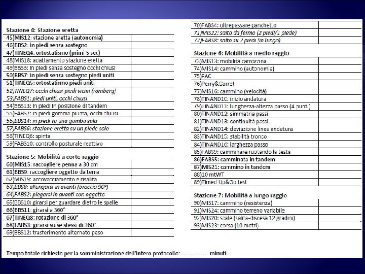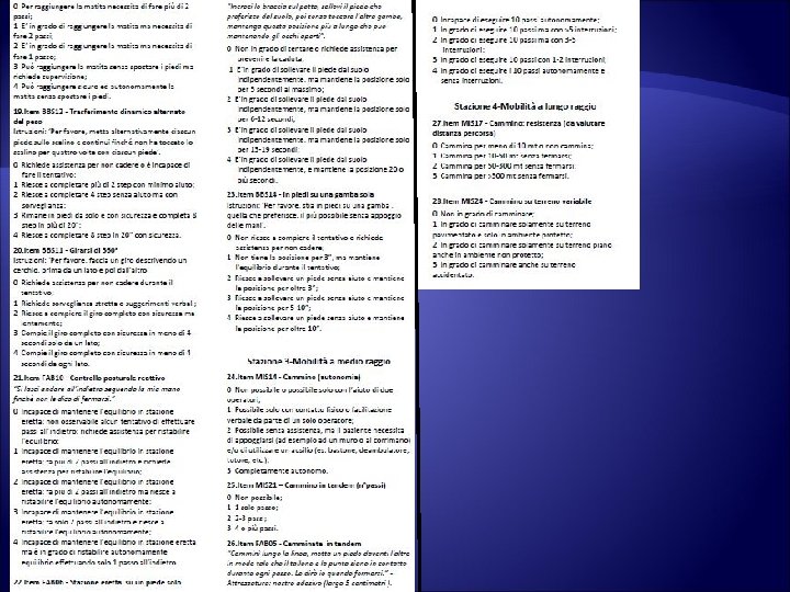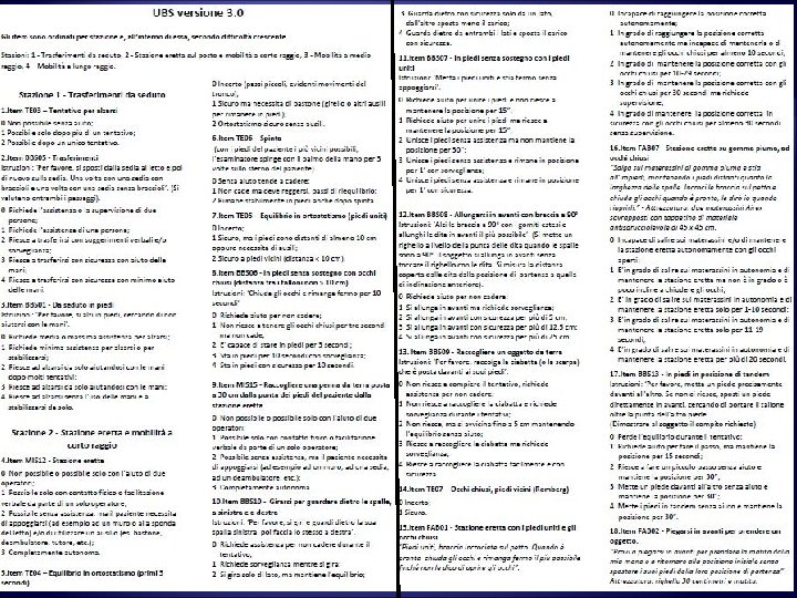 La Unified Balance Scale (Versione 3. 0) • composta da 28 items presi dalle scale già esistenti in letteratura • divisa in 4 stazioni: - Trasferimenti da seduto - Stazione eretta sul posto e mobilità a corto raggio - Mobilità a medio raggio - Mobilità a lungo raggio • somministrabile in 20 -30 minuti