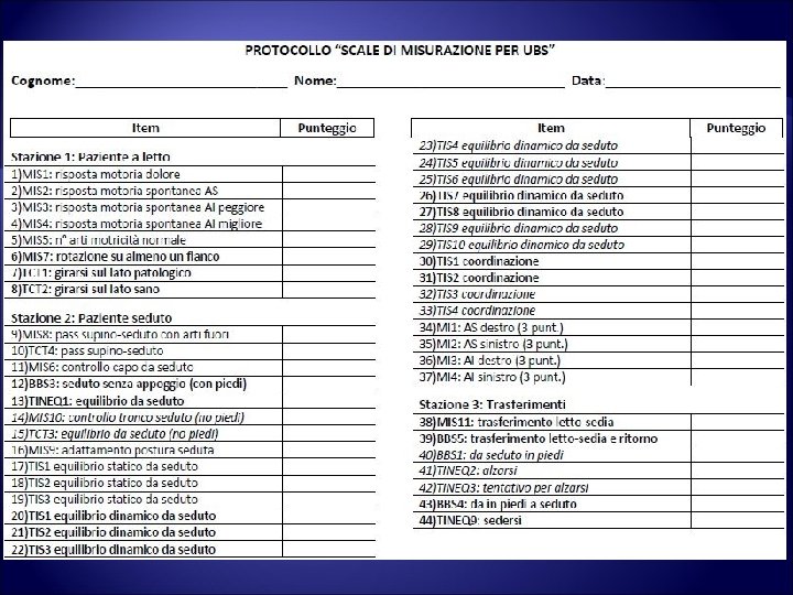 Il protocollo “Scale di misurazione per UBS” 93 Items 7 Stazioni: - Paziente a letto - Paziente seduto - Trasferimenti - Stazione eretta - Mobilità a corto raggio - Mobilità a medio raggio - Mobilità a lungo raggio