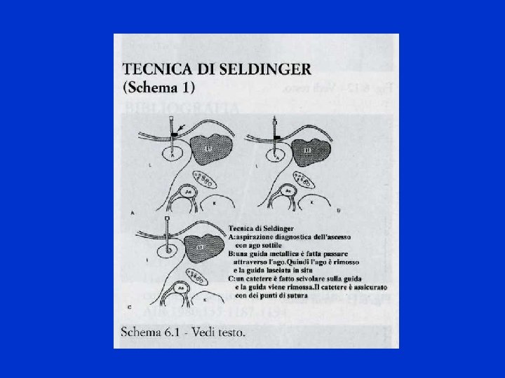 TECNICA DI SELDINGER Questa tecnica consiste nel far passare attraverso l’ago usato per l’esplorazione diagnostica(Angiocath) una guida metallica. Dopo aver verificato la corretta posizione della guida con una scansione TAC si estrae l’ago e sulla guida si fa scivolare un catetere dilatatore e infine un catetere Pig-Tail del calibro tra i 10 e i 14 F. Si conferma il tutto con altra scansione TAC e si sfila la guida e si procede ad una prima aspirazione di materiale purulento. Il catetere viene assicurato alla cute con punti di sutura e collegato ad una busta.