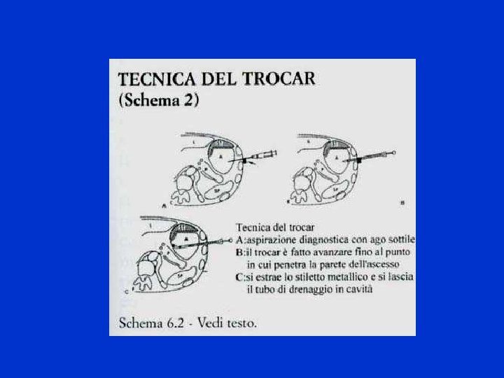 TECNICA DI TROCAR Qualora la raccolta è estesa e superficiale si usa questa tecnica che consiste nell’usare un catetere tipo trocar che viene inserito direttamente nella raccolta. Raggiunta la raccolta si estrae lo stiletto metallico e si lascia il drenaggio nella raccolta.