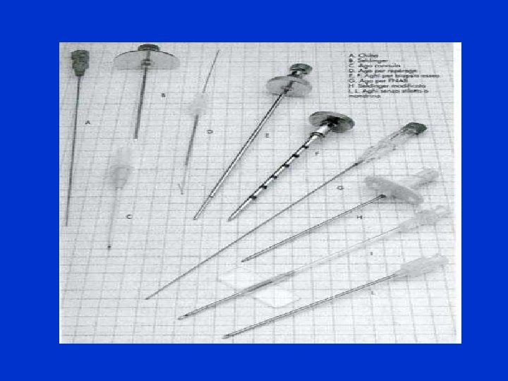 BIOPSIA TC GUIDATA AGHI TRANCIANTI Aghi di ampio calibro, con diverse conformazioni della punta e una apertura su un lato. Permettono esami istologici.