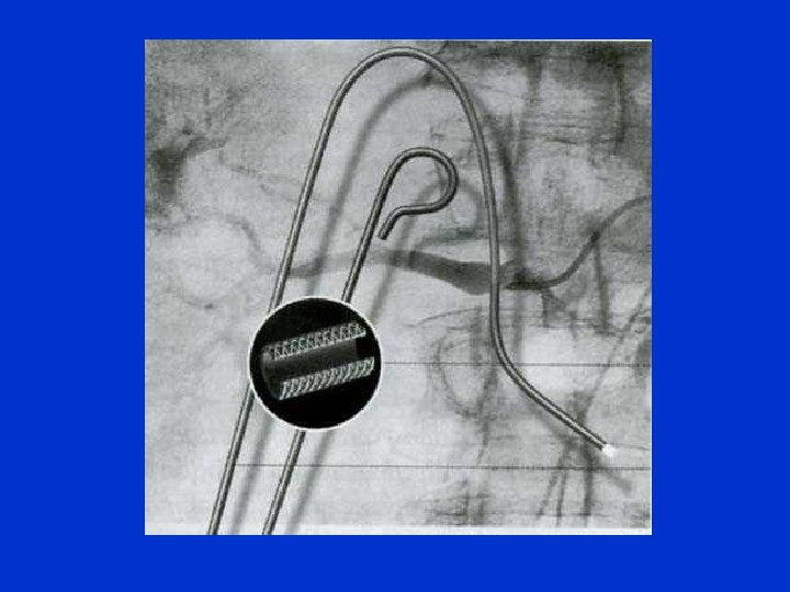 RECUPERO CORPI ESTRANEI Essi sono costituiti da un catetere guaina nel quale scorre un filo metallico alla cui punta è saldato l’elemento catturatore che solitamente ha la forma di un cestello, un cappio, una pinza. Una volta agganciato il corpo estraneo si fa avanzare il catetere guaina nell’elemento catturatore e si sfila tutto tramite l’introduttore inizialmente posizionato. Sé il corpo estraneo non passa nell’introduttore si deve ricorrere all’asportazione chirurgica comunque ora facilitata.
