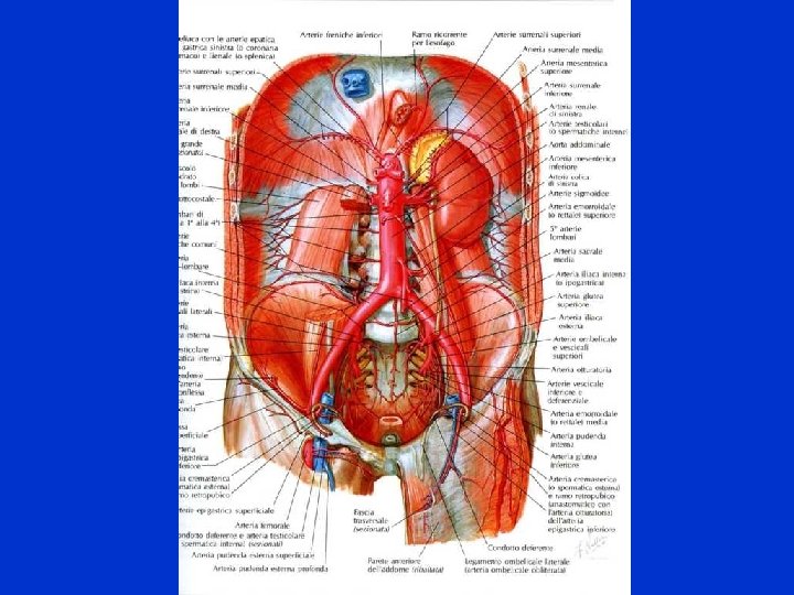 • Aortografia Addominale(Aneurismi, Lesioni arteriosclerotiche, Follow-up post-operatoria); • Arteriografia tripode celiaco; • Mesenterica Superiore; • Mesenterica Inferiore; • Arteriografia Renale(Ectopie, Agenesie, Ipoplasie, Rene a ferro di cavallo, Anomalie nell’origine e distribuzione vasale, Traumi, etc. ); • Arteriografia Pelvica(Arterie iliache ed ipogastriche); • Vasi Periferici(Art. sup. e inf. ) per traumi, Stenosi, MAV, Aneurismi, etc. )