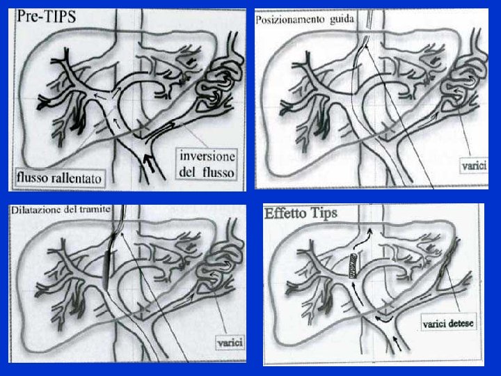 LA TIPS(Transjugular intrahepatic porto-systemic shunt) La TIPS è l’emblema della radiologia vascolare interventistica. Si ricorre ad essa in corso di ipertensione portale per evitare le complicanze a cui si si può incorrere(Emorragie digestive non facilmente controllabili). Si crea artificialmente uno shunt porto-cavale di scarico pressorio tramite il posizionamento di uno stent generalmente autoespandibile. La procedura è alquanto complessa.