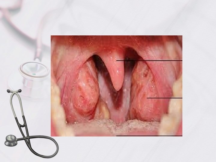 Examenul obiectiv • Dopuri de cazeum alb-gălbui închistate în cripte, mai ales la nivelul polului superior. • Persistenţa lichidului purulent în cripte şi pe suprafaţa amigdalelor. • Cicatrice şi aderenţe pe suprafaţa amigdalelor. • Prezenţa unor microabcese, a unui chist încapsulat pe suprafaţa mediană a amigdalei. • Suprafaţa amigdalei este de o înfăţişare brăzdată. • Adenopatia regională. Ganglionii limfatici submaxilari şi sternocleidomastoidieni sunt măriţi, uneori dureroşi. Din cele expuse rezultă că simptomatologia amigdalitei cronice este bogată şi variată. Diagnosticul de amigdalită cronică poate fi stabilit atunci, când sunt prezente două sau mai multe semne a bolii.