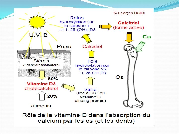 La vit D a un rôle dans la régulation du mb phosphocalcique Le 1, 25 dihydroxycholécalciférol (calcitriol) se lie à son récepteur nucléaire et induit la synthese de la calcium binding protein Ca. BP. qui est responsable des effets biologiques de la vit D celle-ci contribue : -a la minéralisation du squelette fœtal. -a la synthèse d’insuline - a la régulation de la concentration en calcium du lait maternel. fonction principale : est l’absorption du Calcium au niveau de l’enthérocyte, la fonction secondaire : est la fixation du Calcium sur l’os.