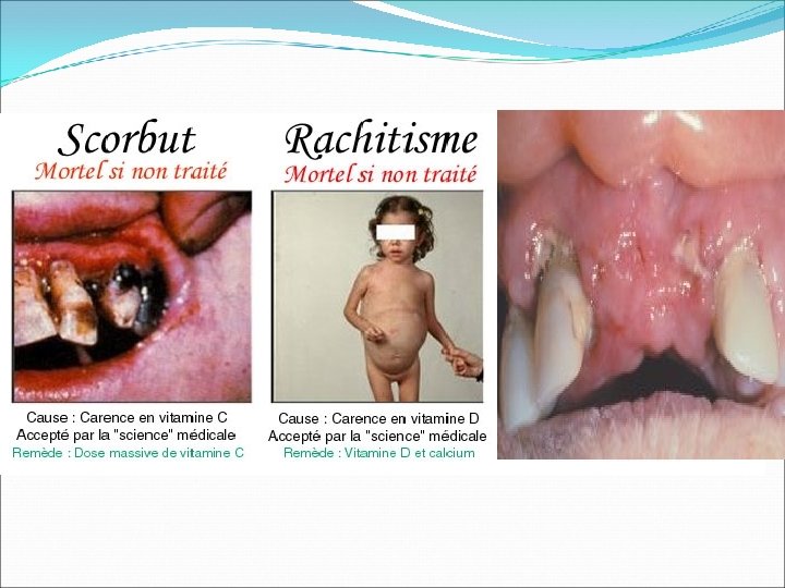 Exemples : -Troubles cutanés (déficit en vitamines du groupe B) -Carence importante et prolongée en vitamine C ‘Scorbut’ ou maladie des gencives. -La carence importante et prolongée en vitamine B 1 peut faire apparaître la maladie ‘Béribéri’ caractérisée par une polynévrite avec troubles neurologiques