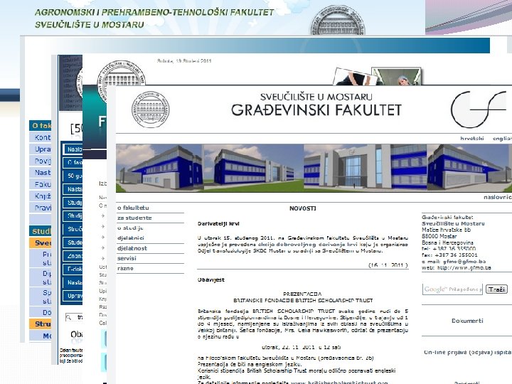 The University of Mostar comprises Faculties: Agriculture Economics Civil engineering Medicine Law Mechanical engineering and computing Philosophy Natural Science and Education Health studies Academy of fine arts Pharmacy • Institutes for: – – – – Agriculture Economics Civil engineering Croatian language, literature and history Latin language Law Mechanical engineering Social researches • Other: – – – University library Student Hostel (Hall of Residence) Student Union and Student Associations, Student Services University Sport Facilities