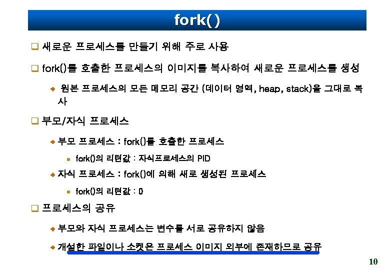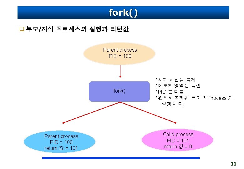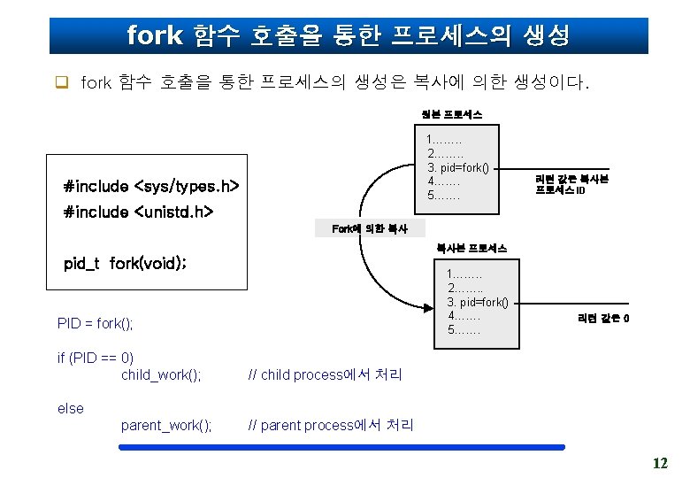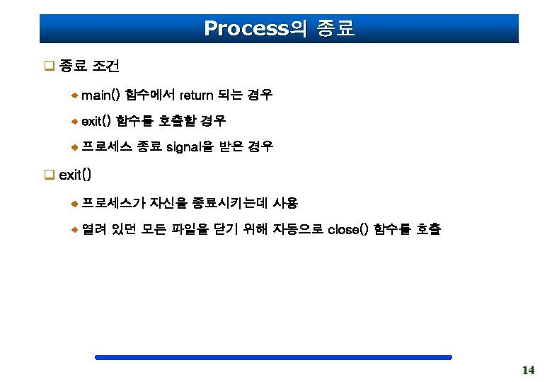 fork 함수 호출을 통한 프로세스의 생성 int a=10; int main() { pid_t pid; int b=20; pid = fork(); ……. } 원본 프로세스 a=10 Data 영역 int a=10; int main() { pid_t pid; int b=20; pid = fork(); ……. pid=1133 b=20 Stack 영역 } a=10 Data 영역 pid=0 b=20 Stack 영역 복사본 프로세스 13