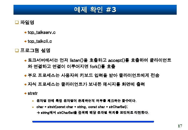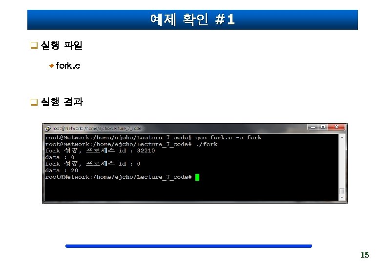예제 확인 #2 q 실행 파일 fork_test. c pid_t getpid(void) //자신의 PID를 얻음 pid_t getppid(void) //부모 프로세스의 PID를 얻음 16