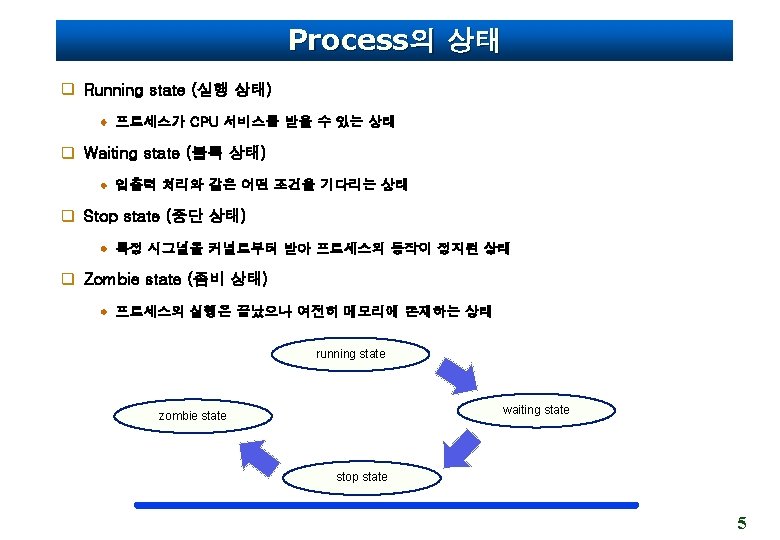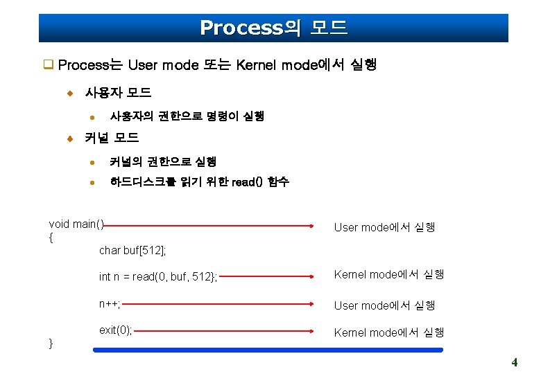 Process의 정의 q Program 이란 C, C++, Java와 같은 프로그램 언어로 작성된 소스코드 q Process 란 Running program 생성된 프로세스는 운영체제의 의해 할당된 고유한 ID를 지닌다. (ps –u) 하나의 프로그램 내에서 여러 개의 프로세스가 동시에 실행 될 수 있다. hard disk main memory Process 1 Process 2 read Program 1 Program 2 CPU Process 3 read Process 4 read Program 3 Program 4 3