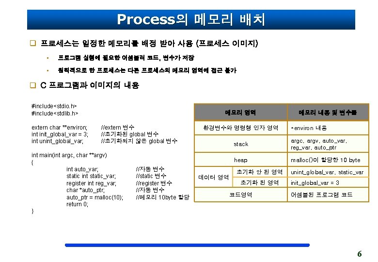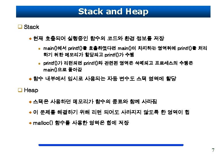 Stack func() 호출 process Er ror int main() { char *ptr; ptr = func(); } char *func() { char arr[10]; return arr; } 10 byte 배열 할당 Address return Stack 영역 8