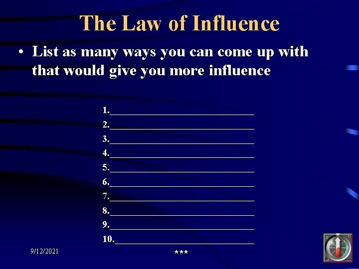 The Law of Influence The true measure of leadership is influence – Nothing more, Nothing less 9/12/2021 *