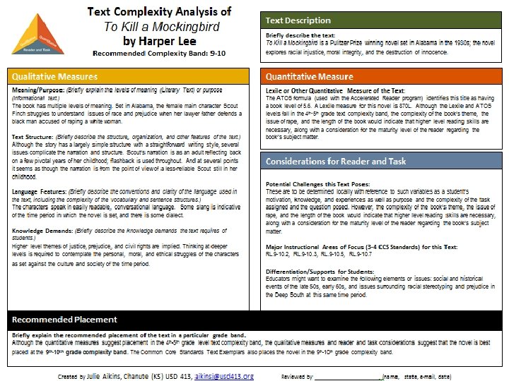 Step 4: Recommended Placement In this instance, Appendix B confirms our evaluation of the novel. To Kill a Mockingbird is placed within the grade 9 -10 text complexity band.