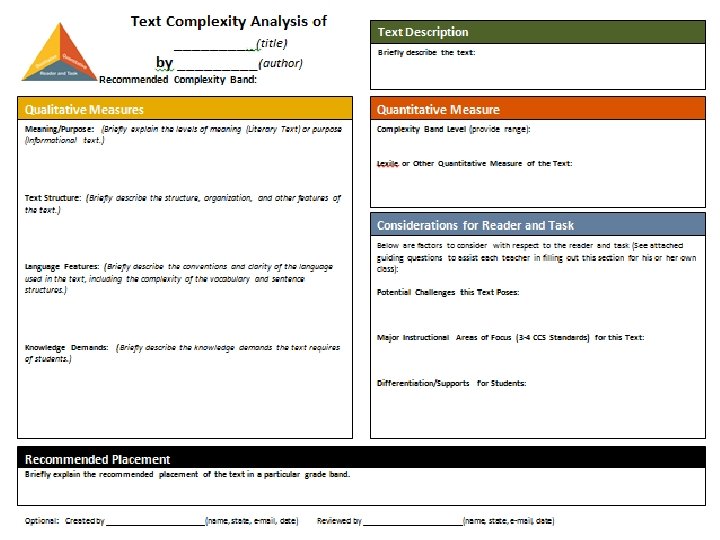 Step 4: Recommended Placement Template for Text Complexity Analysis and Recommended Placement Form: The one-page template provides an opportunity to record the thinking involved in recommending the placement of a specific text into a text complexity band. Keeping a record of such analysis and thinking might be useful documentation in the case that any questions arise in the future.