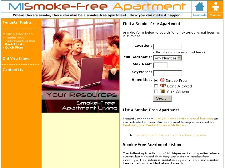Smoke-free apartments in 2008? • Hundreds of thousands of units of SF market-rate • • apartments and condos in Michigan Well over 15, 000 units of SF “affordable” multiunit housing in Michigan 27 public housing commissions in Michigan have adopted SF policies (all since 2005) Most newspapers allow “no smoking” ads Some online apt listing services now have “no smoking” as an amenity item, e. g. , Rent. Linx