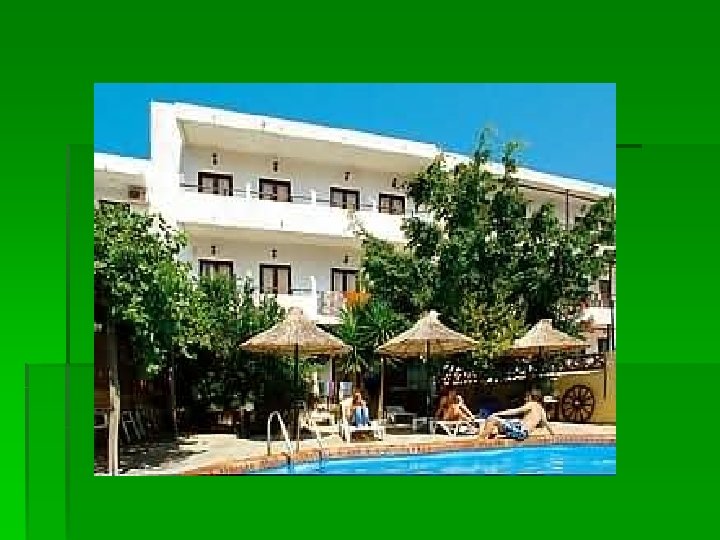 § Je novejše hotelsko naselje. Miren kraj vas bo napolnil z energijo § Lega: na vzpetini s čudovitim pogledom na morje, prodnata plaža Mononaftis 200 m od hotela, na plažo vozi vsak dan kombi; 1, 5 km od vasice po sprehajalni poti. § Hotelska ponudba: zunanji bazen, senčniki in ležalniki ob bazenu brezplačno, otroški bazen, bar ob bazenu, bar pri recepciji, restavracija, animacija, občasni folklorni večeri, tombola, plesna tekmovanja, igre ob bazenu. § Športna ponudba: biljard, namizni tenis, telovadnica in fitness, tenis-trda podlaga. § Sobe: velike sodobno opremljene, z zakonsko posteljo in dvema dodatnima posteljama, telefon, hladilnik, TV, radio, klima, kopalnica-kad ali prha, balkon ali terasa.