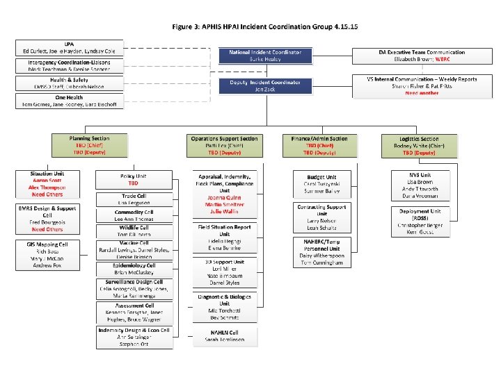 Figure 1: USDA APHIS HPAI MAC, ICG and IMT Overview 4. 15 APHIS Off-scene Policy and Incident Coordination APHIS Administrator & AMT Emergency Management Leadership Council VS Deputy Administrator & VS Executive Team APHIS Incident Coordination Group District Directors APHIS Emergency Operations Center (AEOC) (HQ) Support and coordination Assistant Director Public Information Officer Incident Commander & Unified Incident Management Team SAHO Safety Officer Liaison Officer Planning Section Chief Operations Section Chief Finance/Admin Section Chief Logistics Section Chief Requests and information