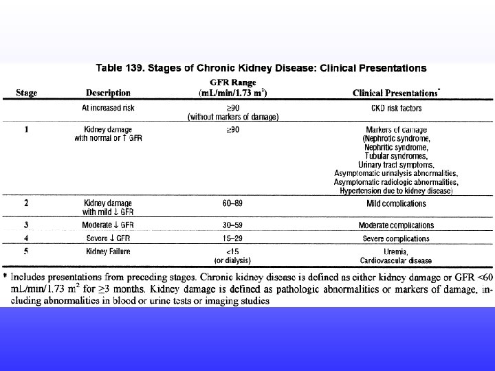 CHRONIC KIDNEY DISEASE • Presence of excessive amounts of urine protein is most common clinical sign of early kidney dysfunction. • Other markers of kidney damage – abnormal urine sediment – abnormal findings on imaging studies – abnormal blood & urine chemistry results that identify renal tubular syndromes