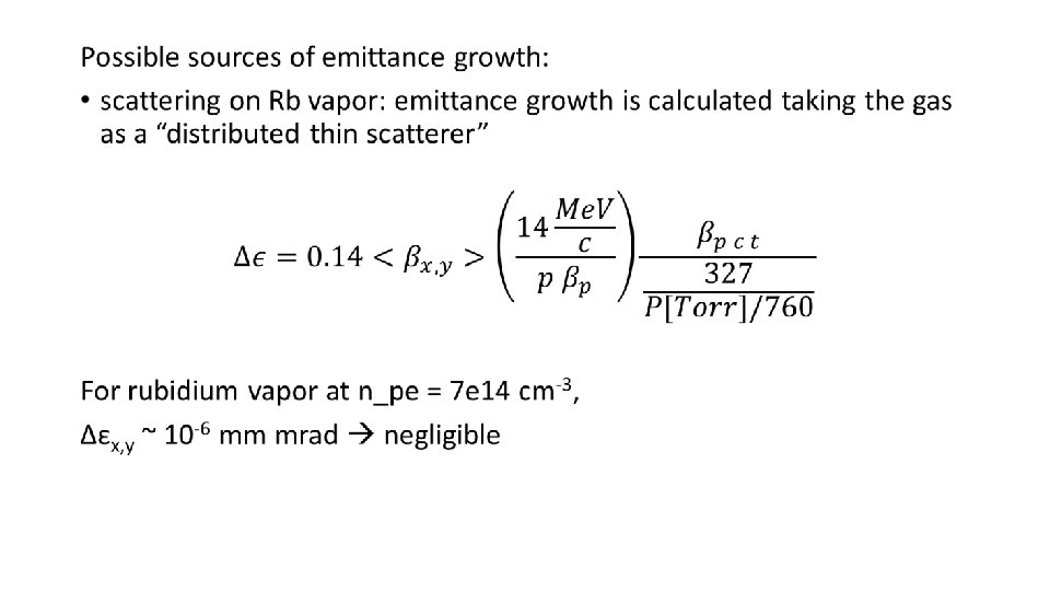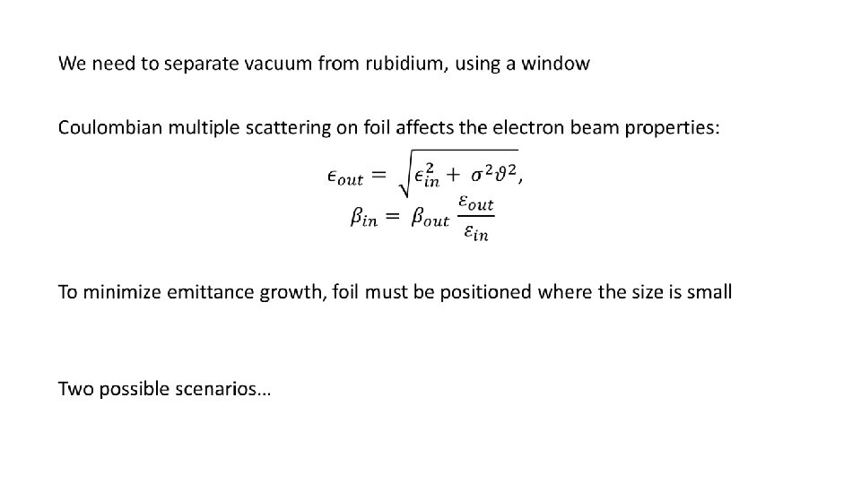 Upper limit: waist is downstream the foil Lower limit: βout < βin βout = 9. 5 mm for npe = 2 E 14 cm-3 ε 0 = 20 mm mrad εin = 2 mm mrad βout = 5. 1 mm for npe = 7 E 14 cm-3 εout= 11 mm mrad εin = 2 mm mrad