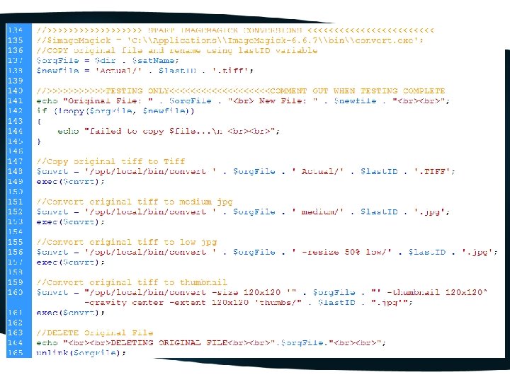 Resize/Rename/Copy IMG • Image. Magick Converted TIFF files to JPEG format o Resized images o Copy images into four directories: § Actual § Medium § Low § Thumbnail o