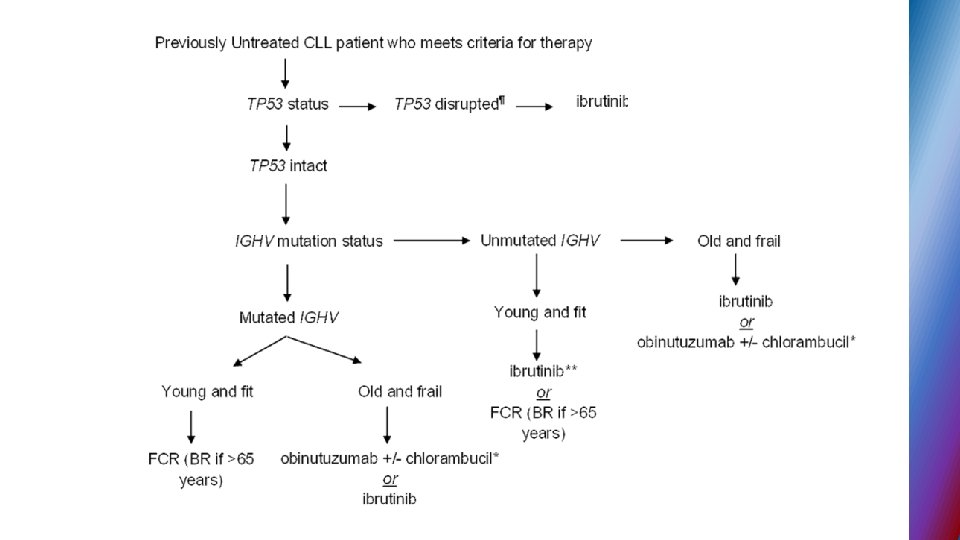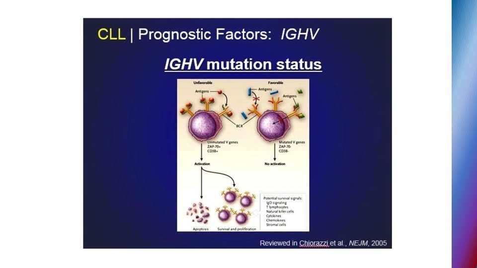 Genetic profile of CLL • FISH technique – genomic aberrations in more than 80% of CLL • Deletion of long arm of chr. 13 • Trisomy 12 • Deletion of long arm of chr. 11 • Deletion of short arm of chr. 17 • Molecular testing for IGHV – mutational status (mutated vs. unmutated)