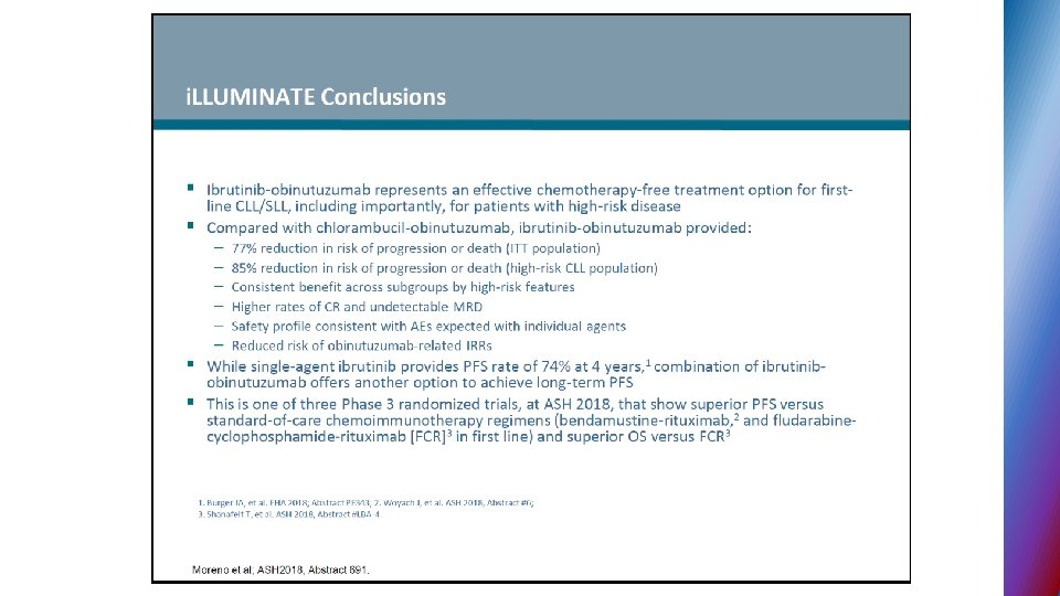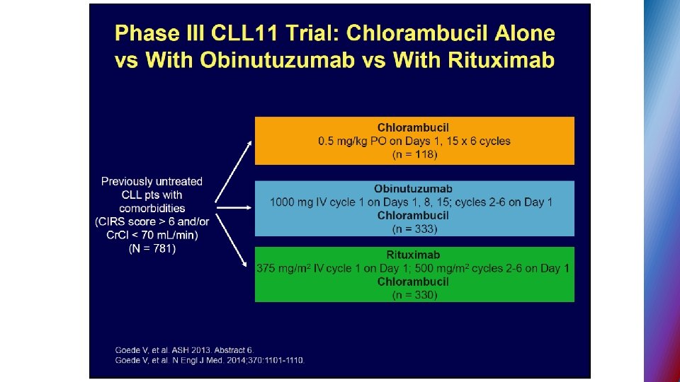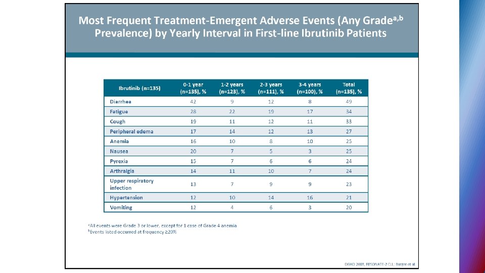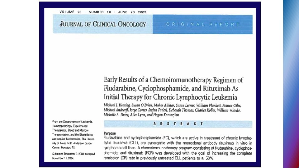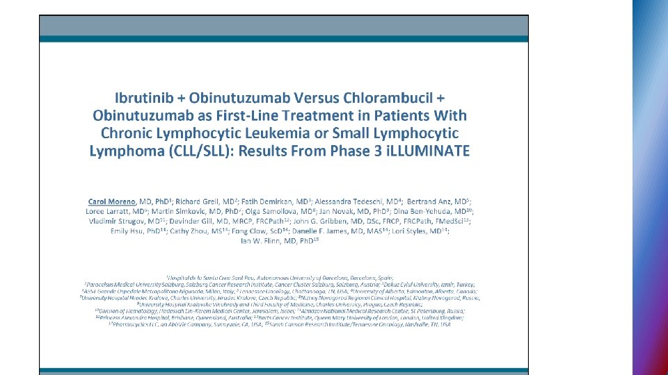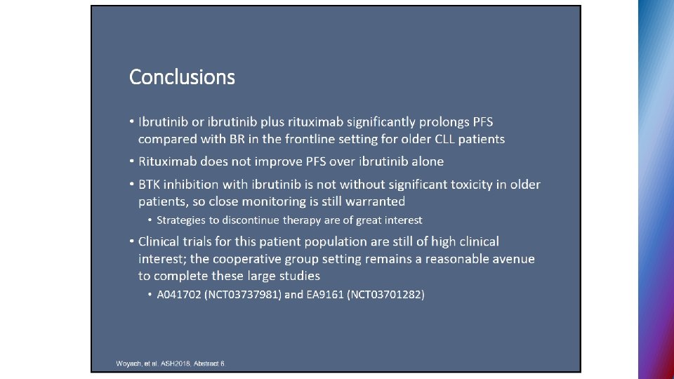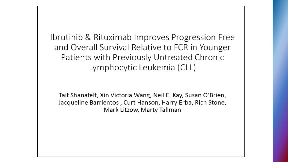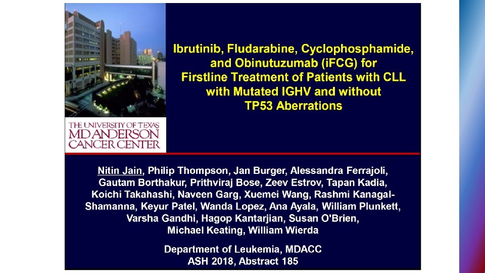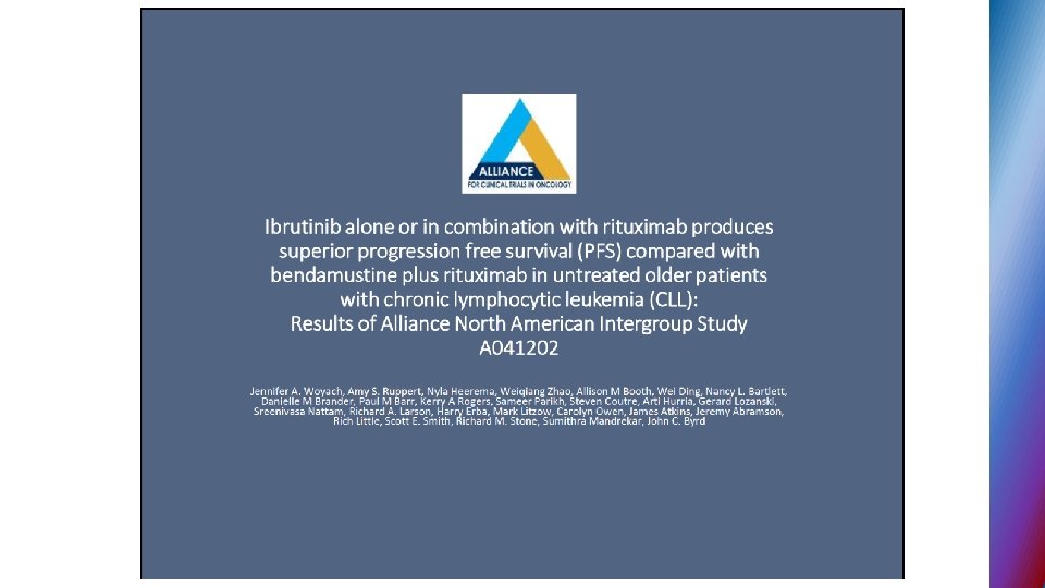 Second generation BTK inhibitors § ACALABRUTINIB – selective BTK inhibitor designed to improve safety and efficacy § targets BTK but not other kinases (EGFR, TEC. . ) § 95% ORR in phase I - II relapse CLL, all 17 p del pts. responded § no major hemorrhage or AF