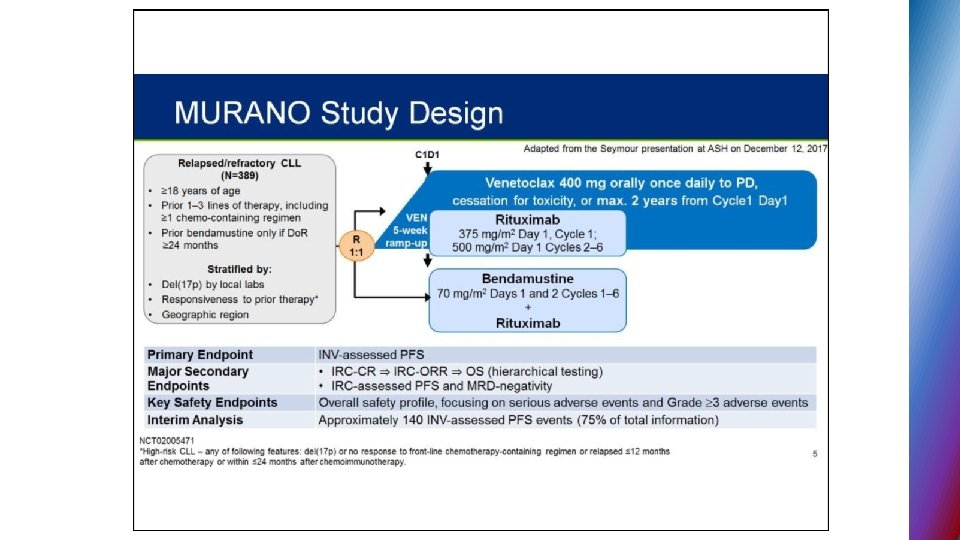 BCL-2 inhibitors § VENETOCLAX § After two decades of drug discovery efforts directed toward finding potent and selective BCL-2 inhibitors § FDA approval – 4/2016 – second line for CLL pts. del 17 p
