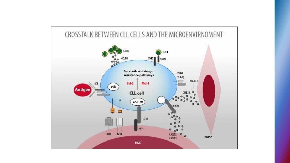 Biological background Key roles in CLL development • B-cell receptor (BCR) activation and signaling cascade • Microenvironment – interaction of leukemic cells with T lymphocytes , stromal cells • B- cell leukemia/lymphoma 2( BCL-2) protein overexpression → resistance to apoptosis