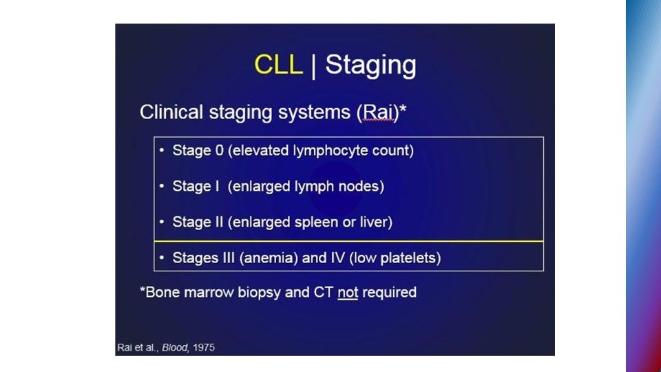 CLL - active disease • Progressive bone marrow failure • Bulky disease • Uncontrolled autoimmune cytopenias • Rapid LDT (Lymphocyte Doubling Time) • Presence of B symptoms