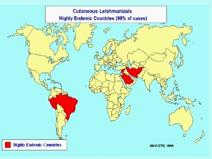 Epidemiology • • 90 countries affected (77 developing ones) 350 millions at risk Prevalence: 12 millions Incidence 1. 5 -2 millions – ¾ CL – ¼ VL (mostly children) • Major health problem: – 5 countries visceral – 14 countries cutaneous leishmaniasis (CL) • 90% of VL in 7 countries • 80% of CL in 7 countries