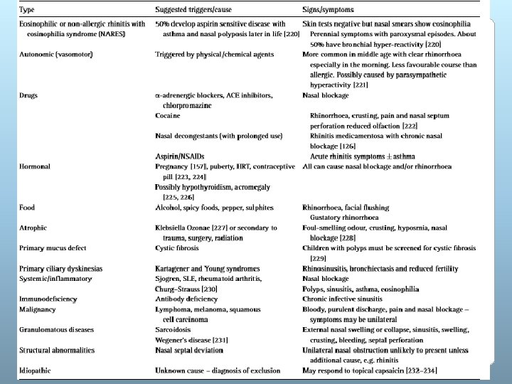 �Drug induced rhinitis � Rhinitis medicamentosa �Rhinitis of pregnancy � Honeymoon rhinitis �Emotional rhinitis �Rhinitis due to hypothyroidism � Gustatory rhinitis �Non-air flow rhinitis �Primary mucus defect & ciliary diskinesia �Immunodeficiency �Granulomatous disease �Malignancy �Structural abnormalities Various eponyms