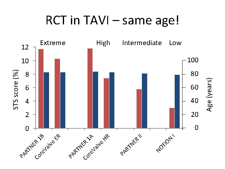 TI NO I II ON ER 10 100 8 80 6 60 4 40 2 20 0 0 Age (years) High TN HR 1 A ER 1 B Extreme PA R ER lve Va re Co TN Va lve ER STS score (%) 12 PA R re Co TN PA R RCT in TAVI – same age! Intermediate Low