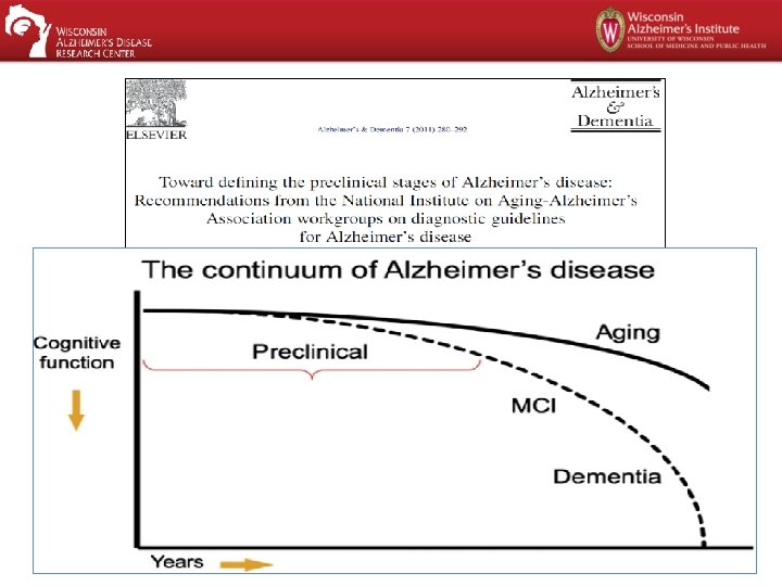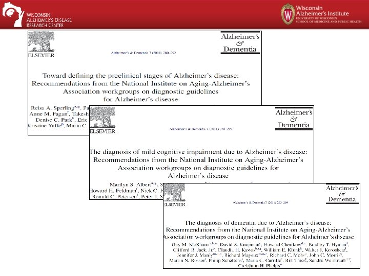 Updates II: Diagnosis • AD has three stages – Preclinical • Long, asymptomatic stage – Prodromal (aka mild cognitive impairment) • Emergence of initial symptoms – Dementia • Symptoms sufficiently severe to produce a dementia • Does away with the 2 -step process • “Alzheimer's disease” as brain pathology vs. clinical syndrome
